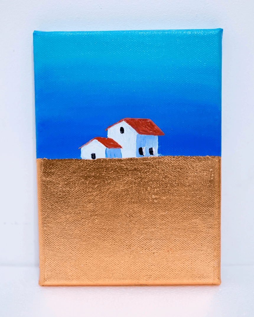 Original oil painting on stretched canvas - Home Sweet Home - with shiny rose gold leaf elements.